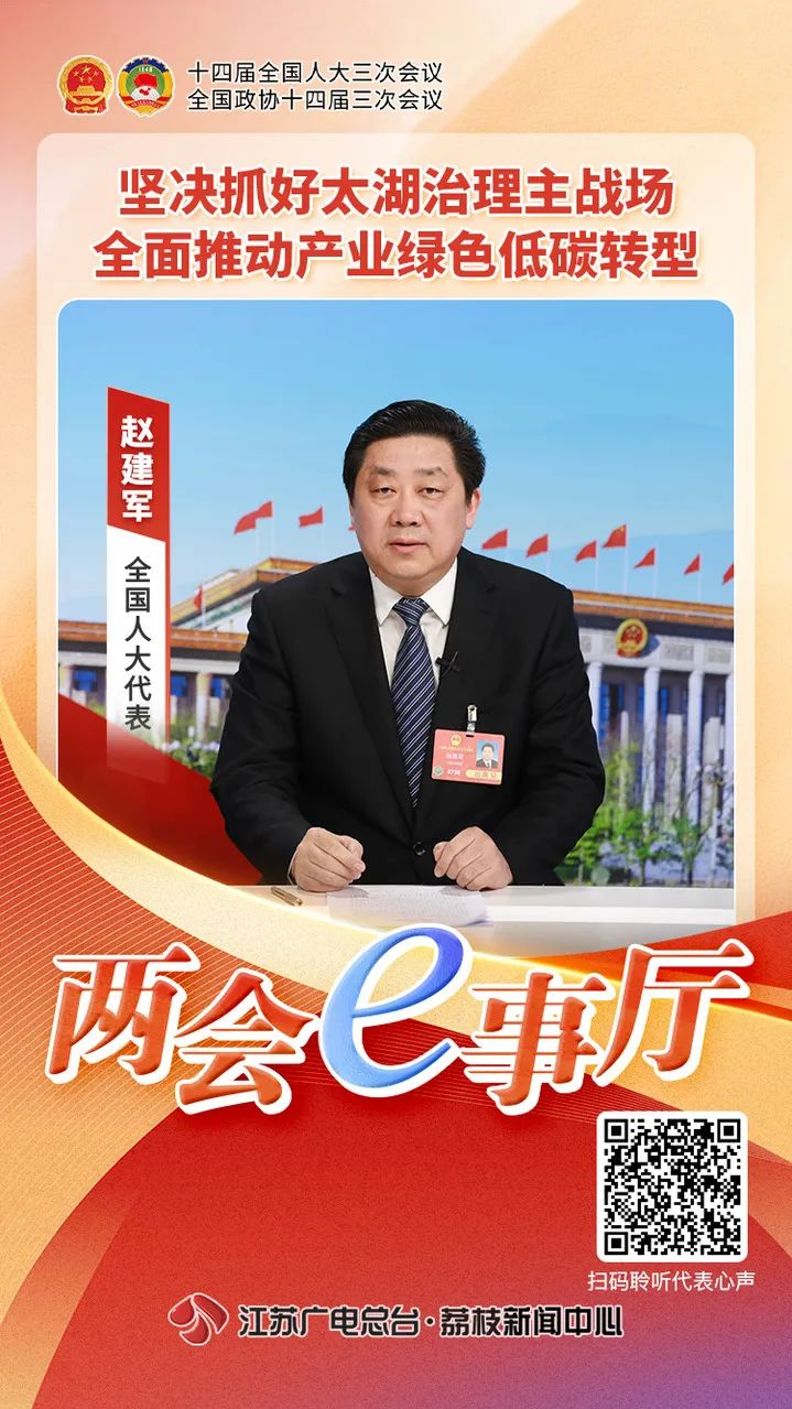 2025年全国两会期间,江苏省广播电视总台推出特别报道《两会e事厅》全媒体访谈。全国人大代表、无锡市市长赵建军走进演播室。他表示,将牢记总书记在参加江苏代表团审议时提出的“坚持推动传统产业改造升级和开辟战略性新兴产业、未来产业新赛道并重”的要求,抓好太湖治理无锡主战场,加快产业绿色低碳转型,着力打造人与自然和谐共生、高质量发展与高水平保护相得益彰的实践样本。